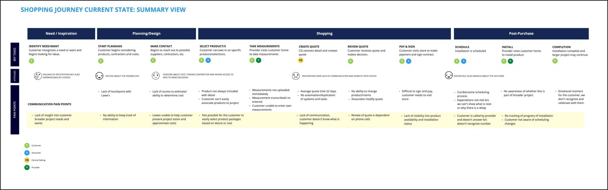 At the heart of a customer-centric organization is a customer experience program with a customer experience and journey map as its foundation. I could not have completed this difficult project without a detailed understanding of the customer and the Lowe's associate, so having built the omnichannel journey map ahead of time kept me two steps ahead. There were no surprises, which helped me stay on schedule throughout the project.