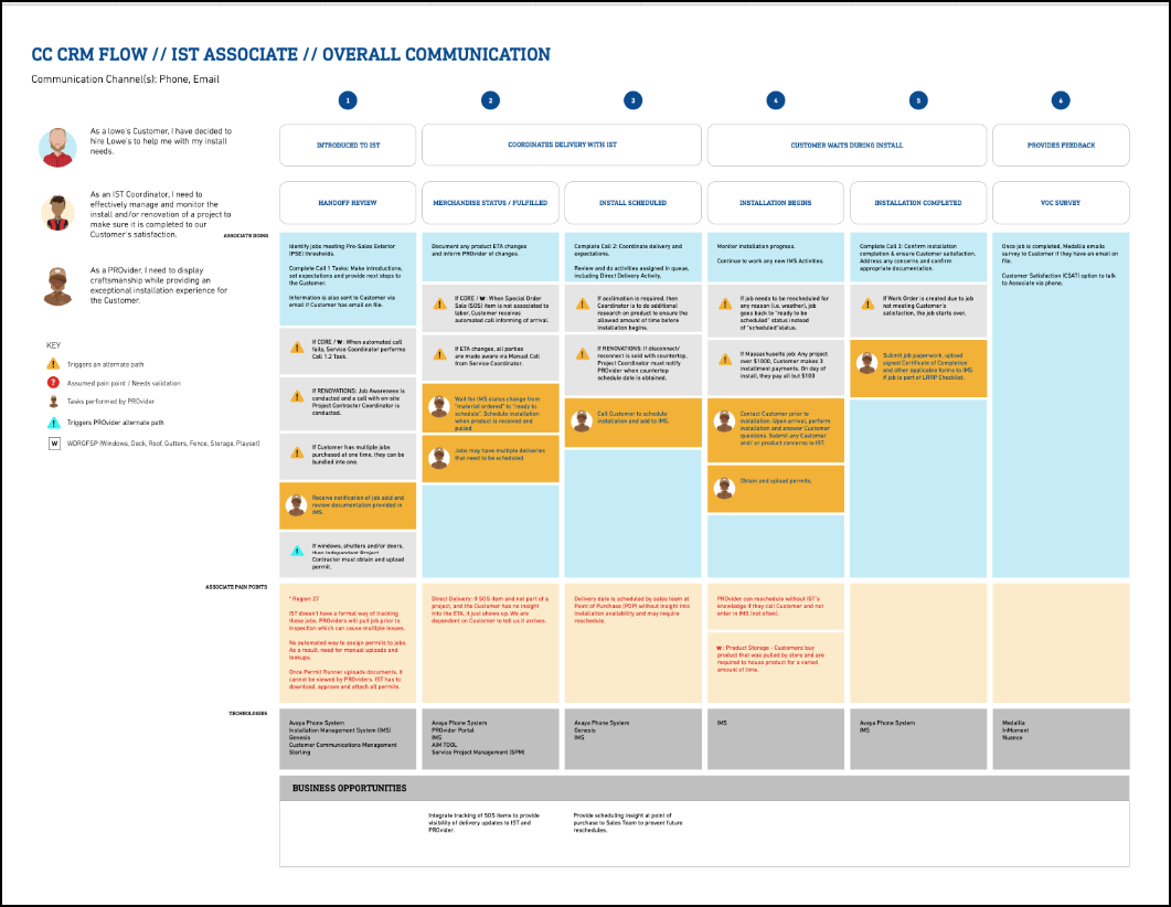 One of the design teams participating in this project created a service map of the different steps Lowe's associates had to take to create sales quotes and how they managed installations. Having a service map to help fill the complicated quote-to-sale associate experience gaps was great.