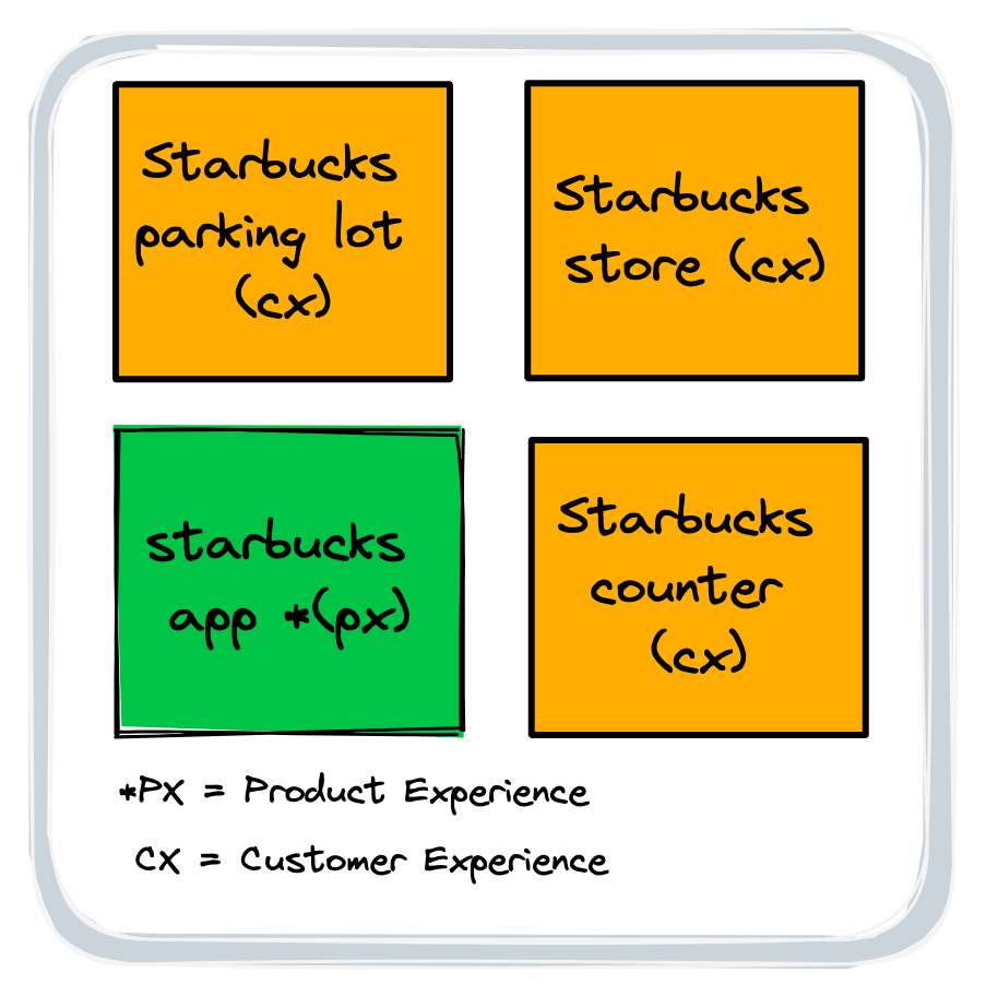 However, if you’re building a journey map have customers interacting with a digital product in a broader customer experience, I would place (PX) for the product in parenthesis each time a customer interacts with a product and completes user tasks. Different teams work on improving touchpoints, so for those teams, calling out different interaction touchpoint types is useful.